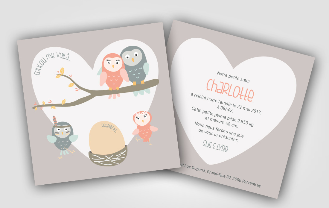 Réalisation d’un faire-part « chouette » pour annoncer la naissance d’une petite fille*.
